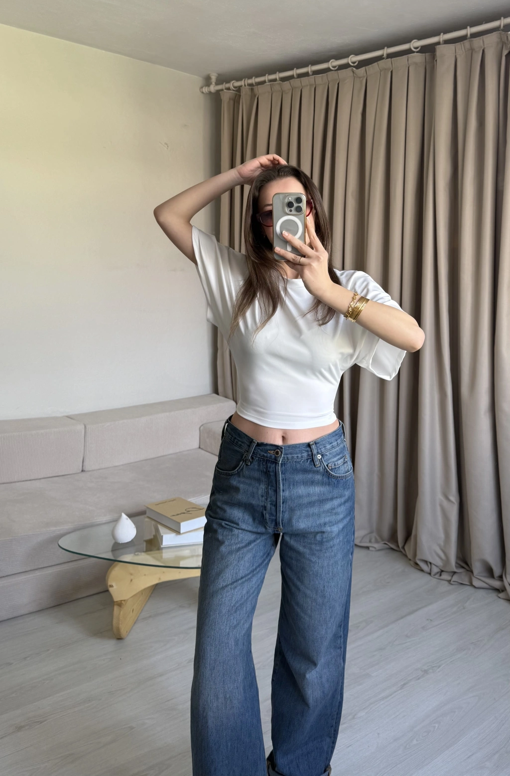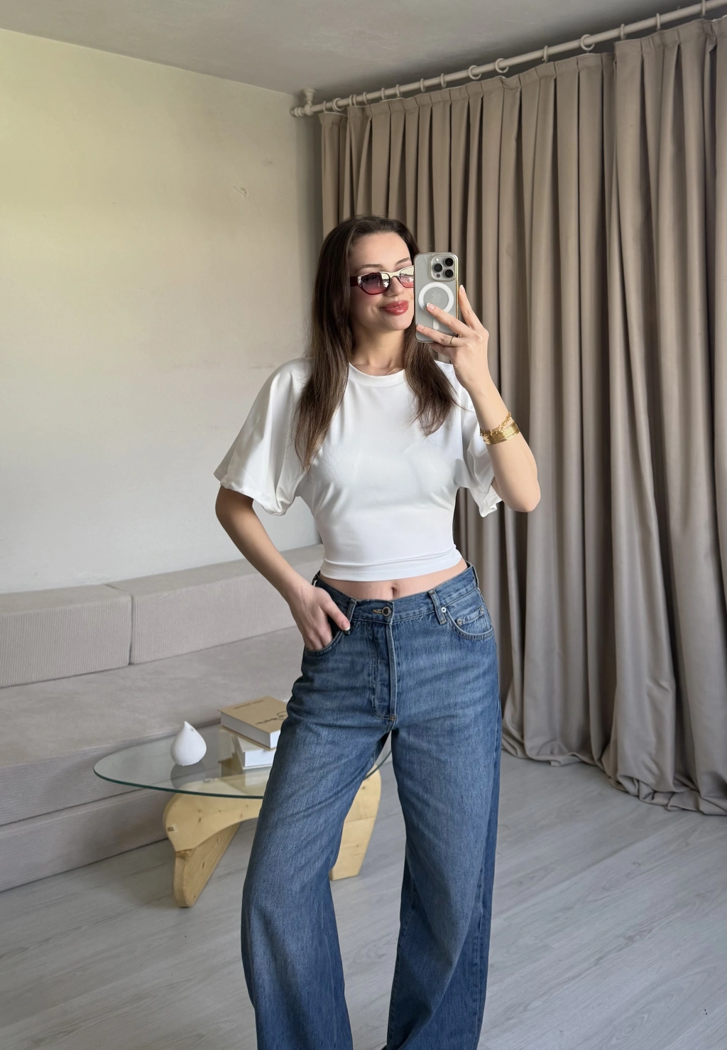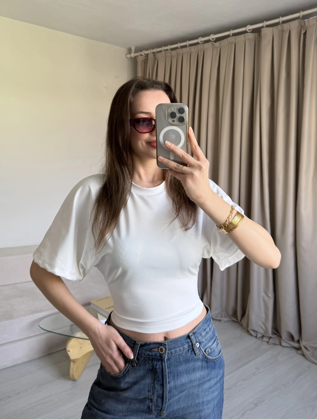 Beyaz Belden Oturtmalı Yarasa Kol Bluz