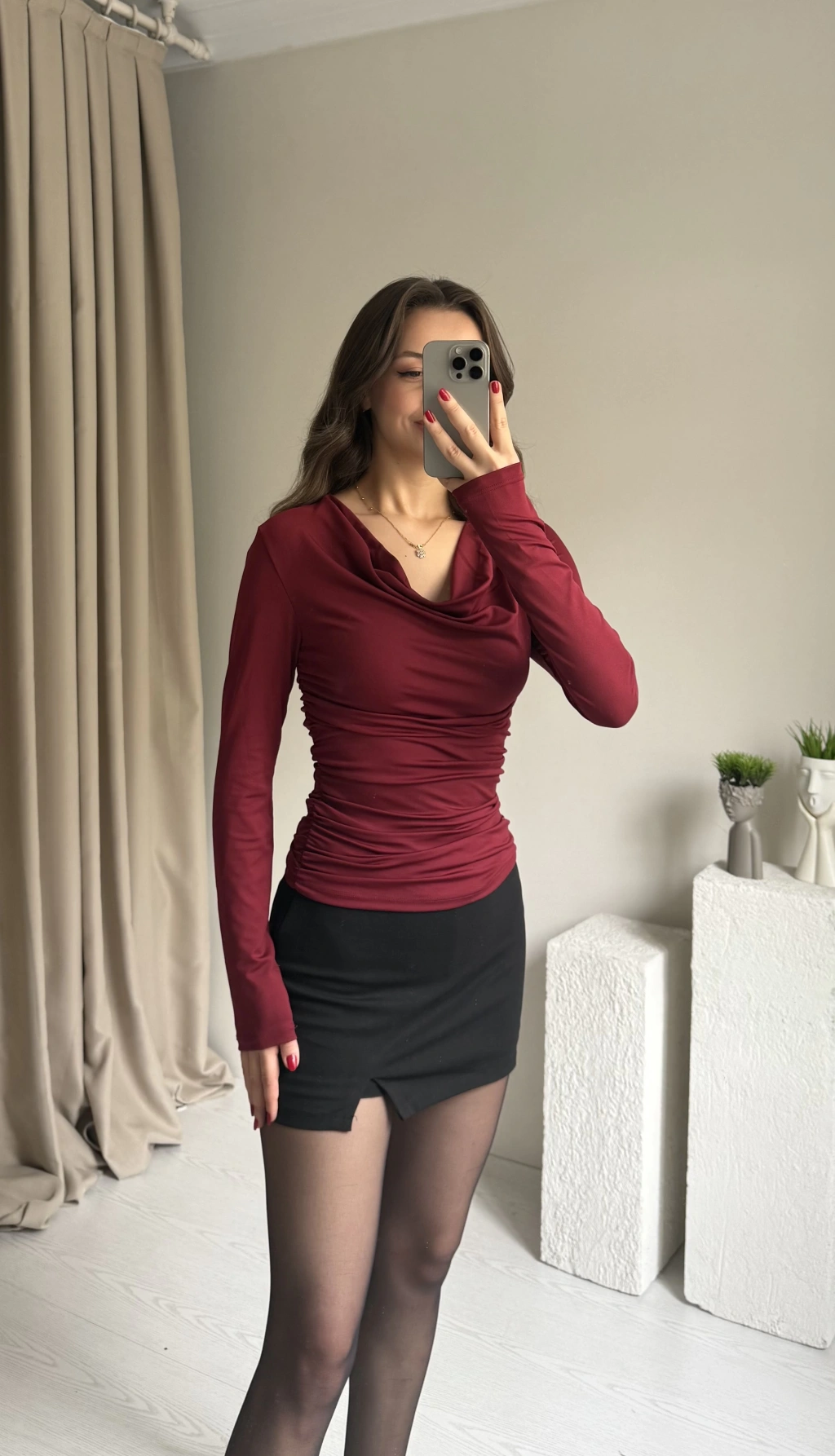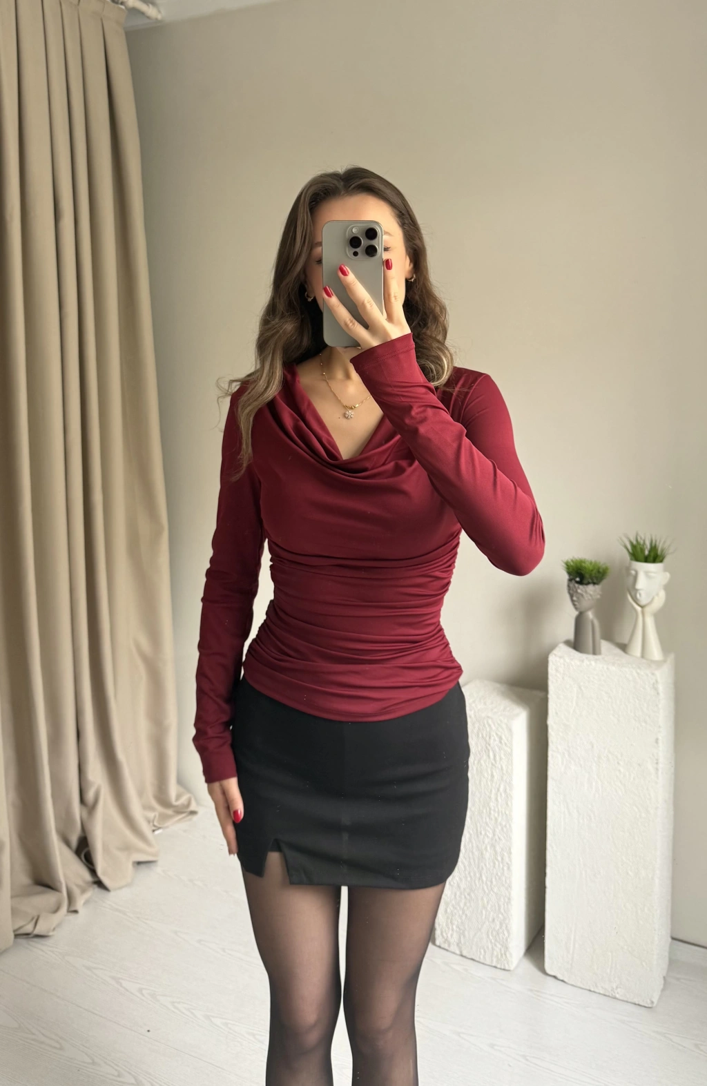 Bordo Şal Yaka Büzgülü Bluz