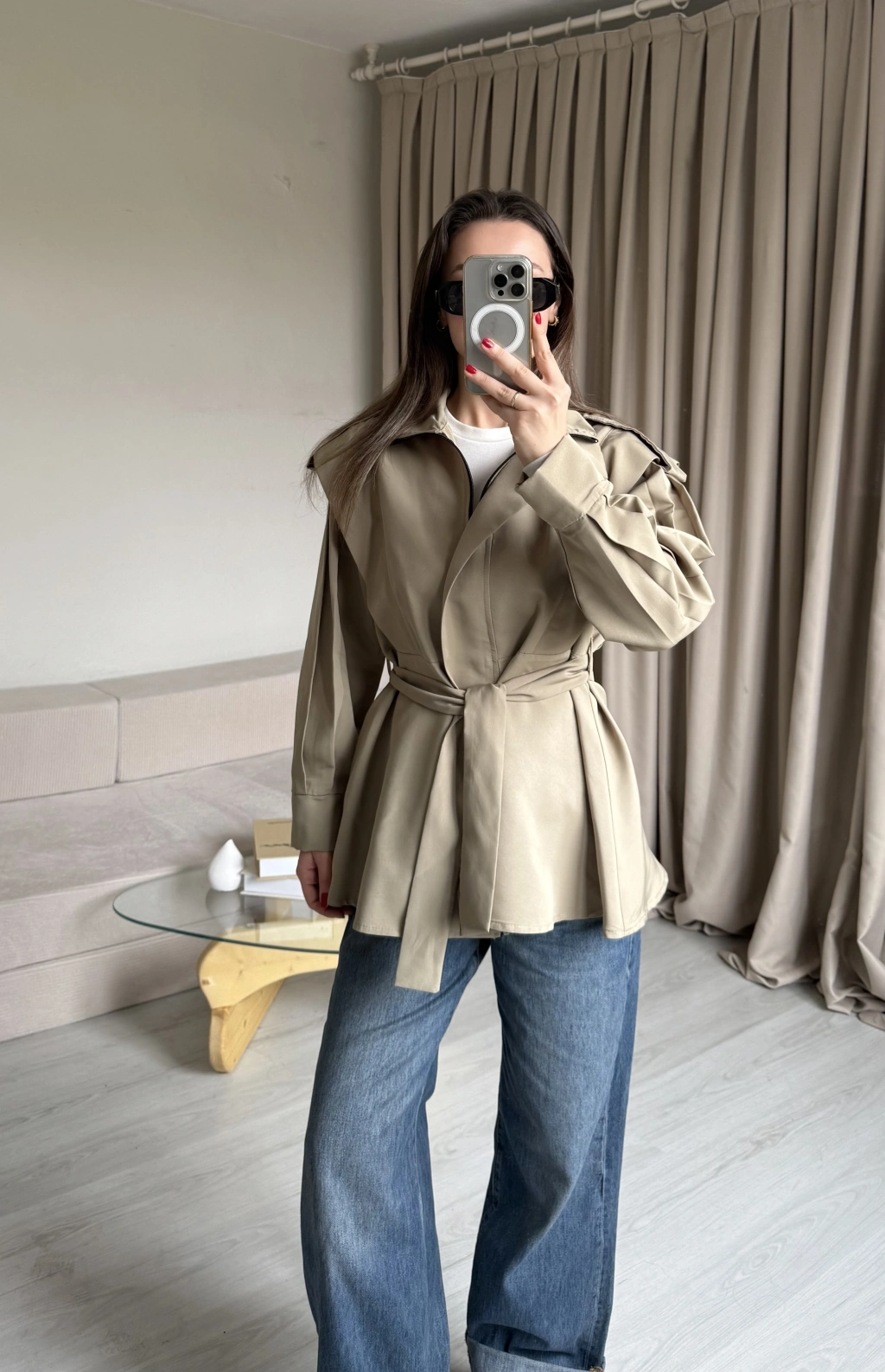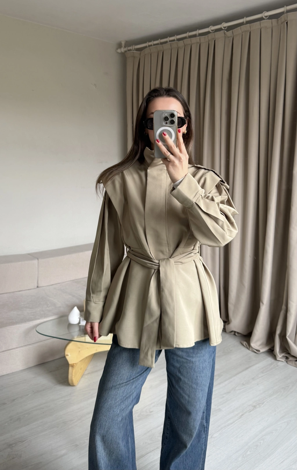 Çağla Yeşil Fermuarlı Dik Yaka Trençkot