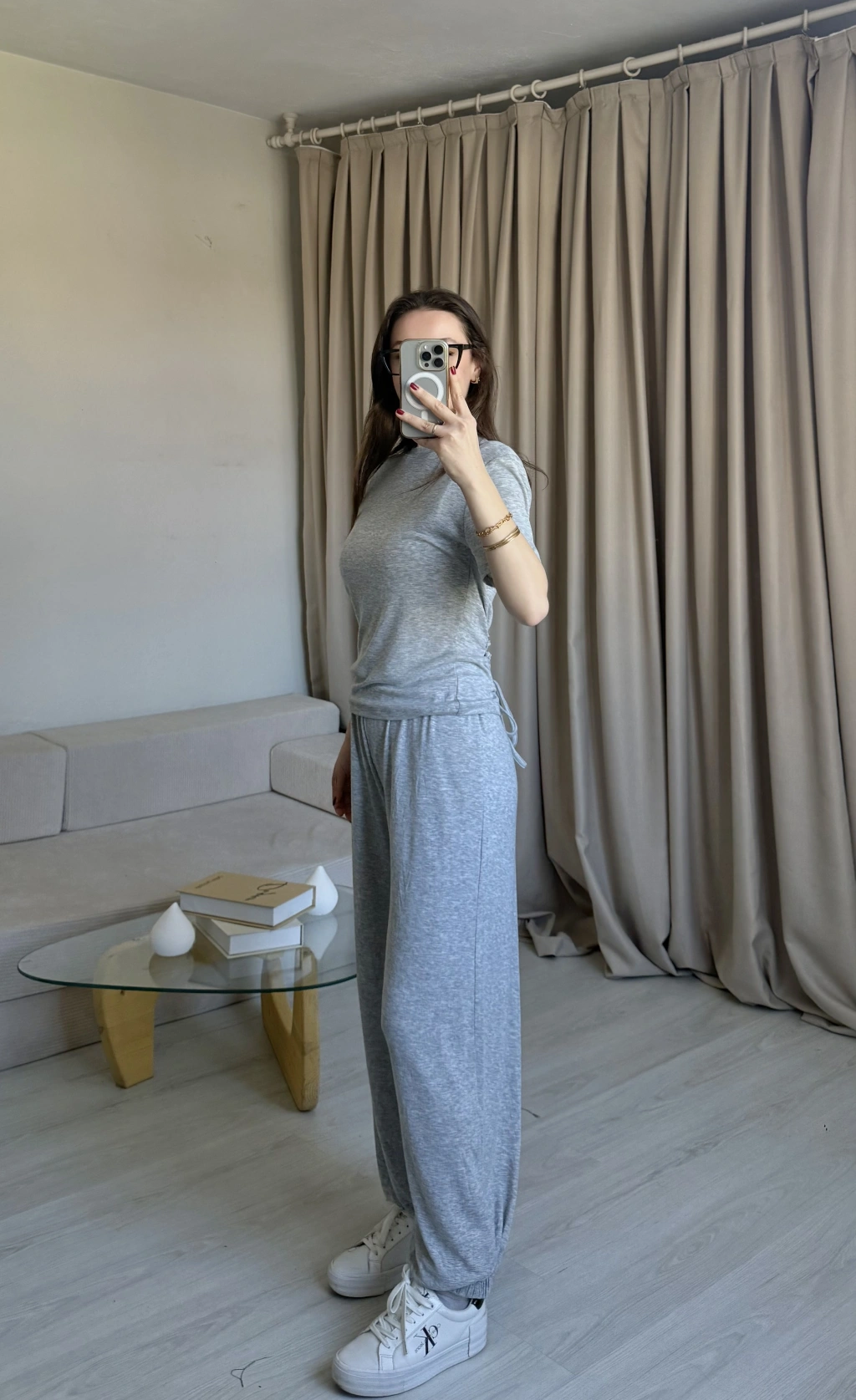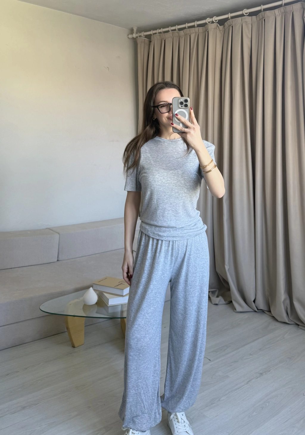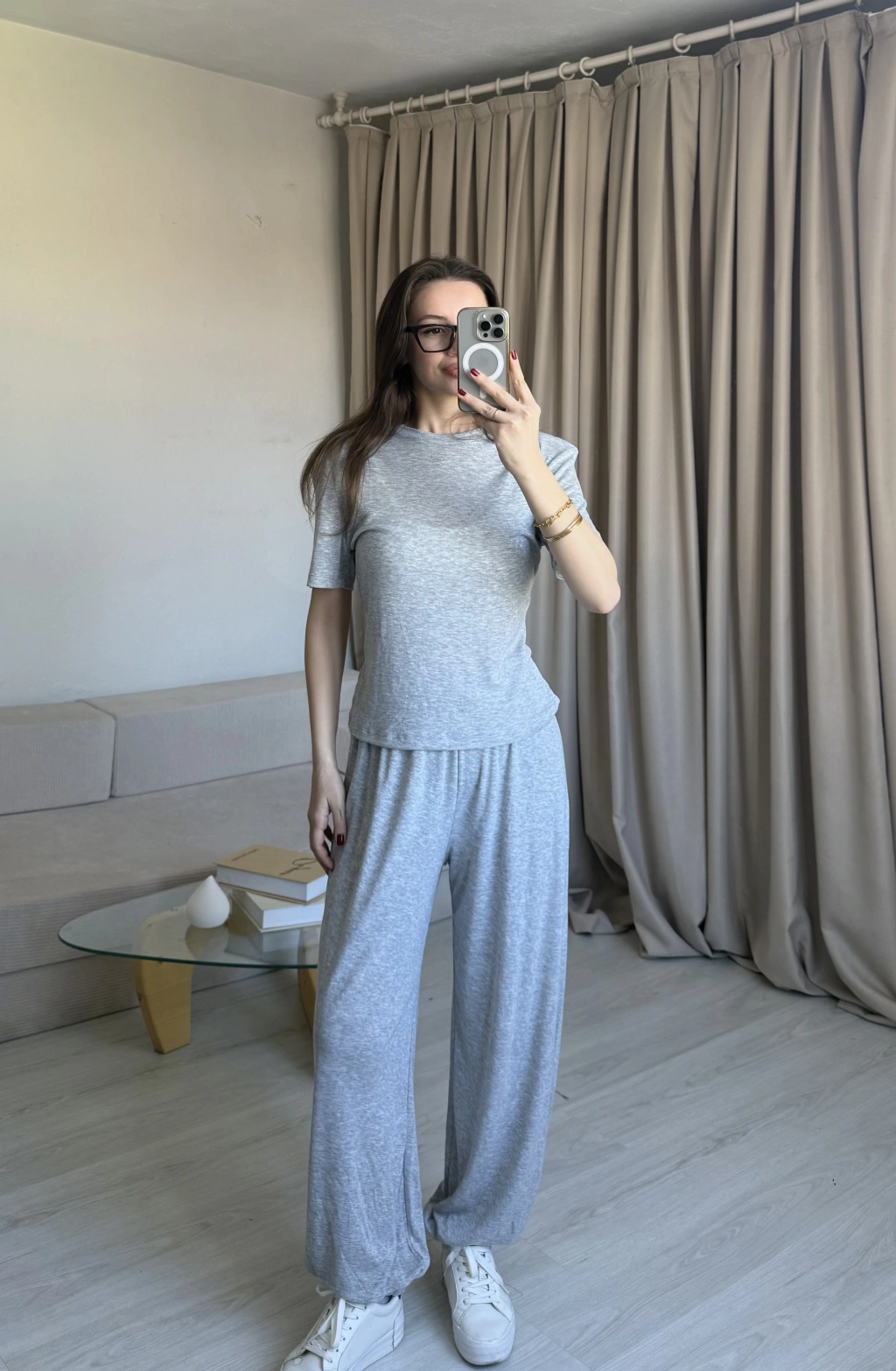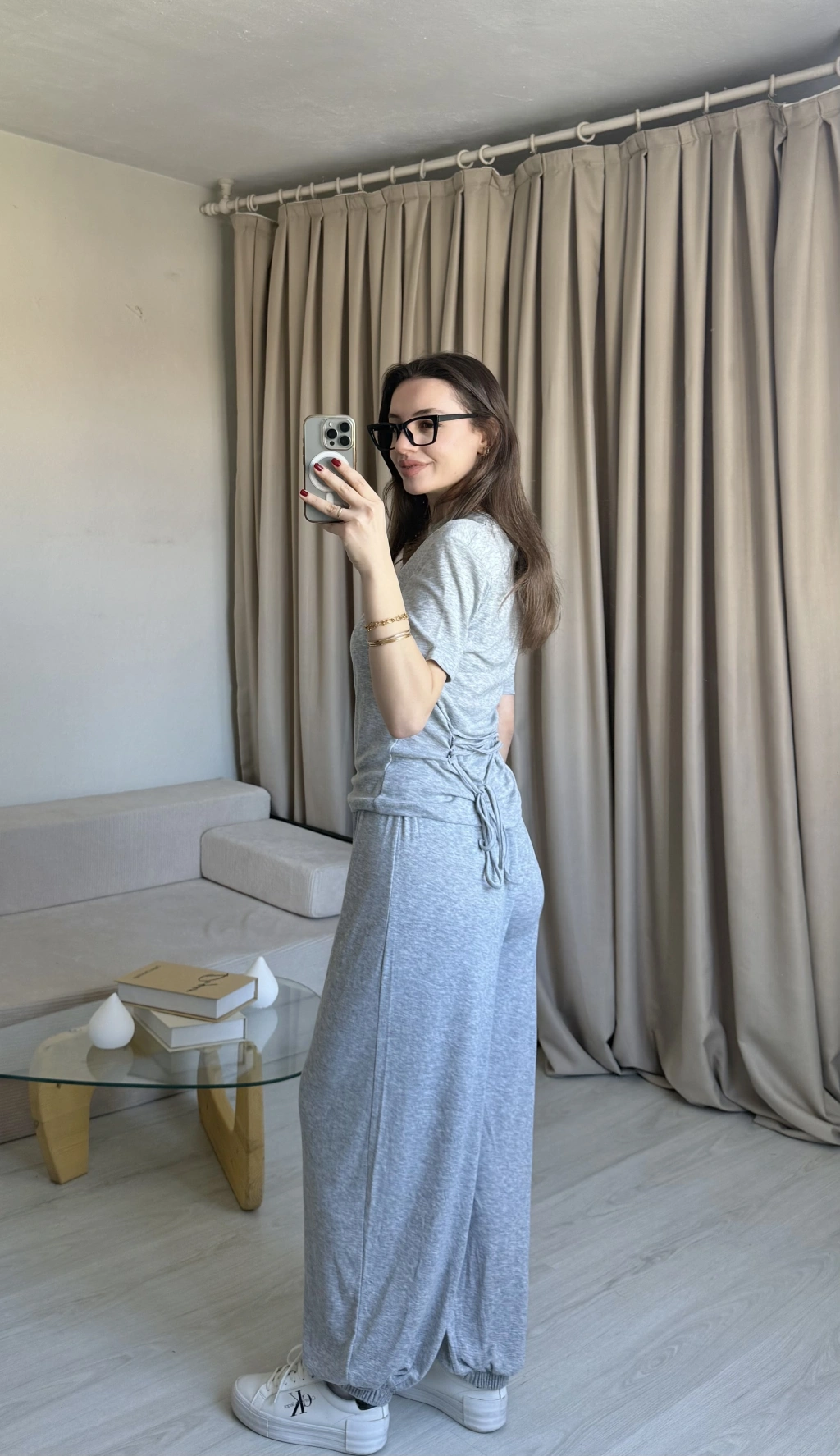 Gri Belden Bağlamalı Kısa Kollu Eşofman Takımı