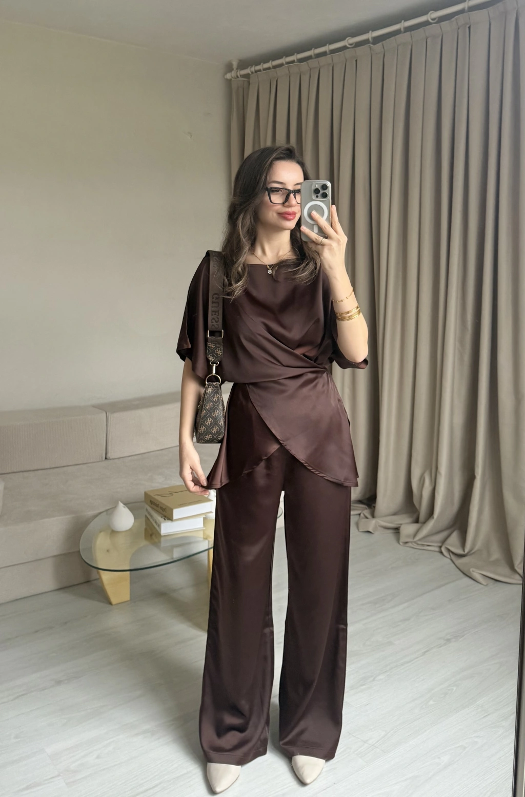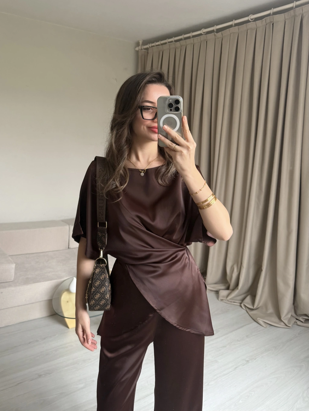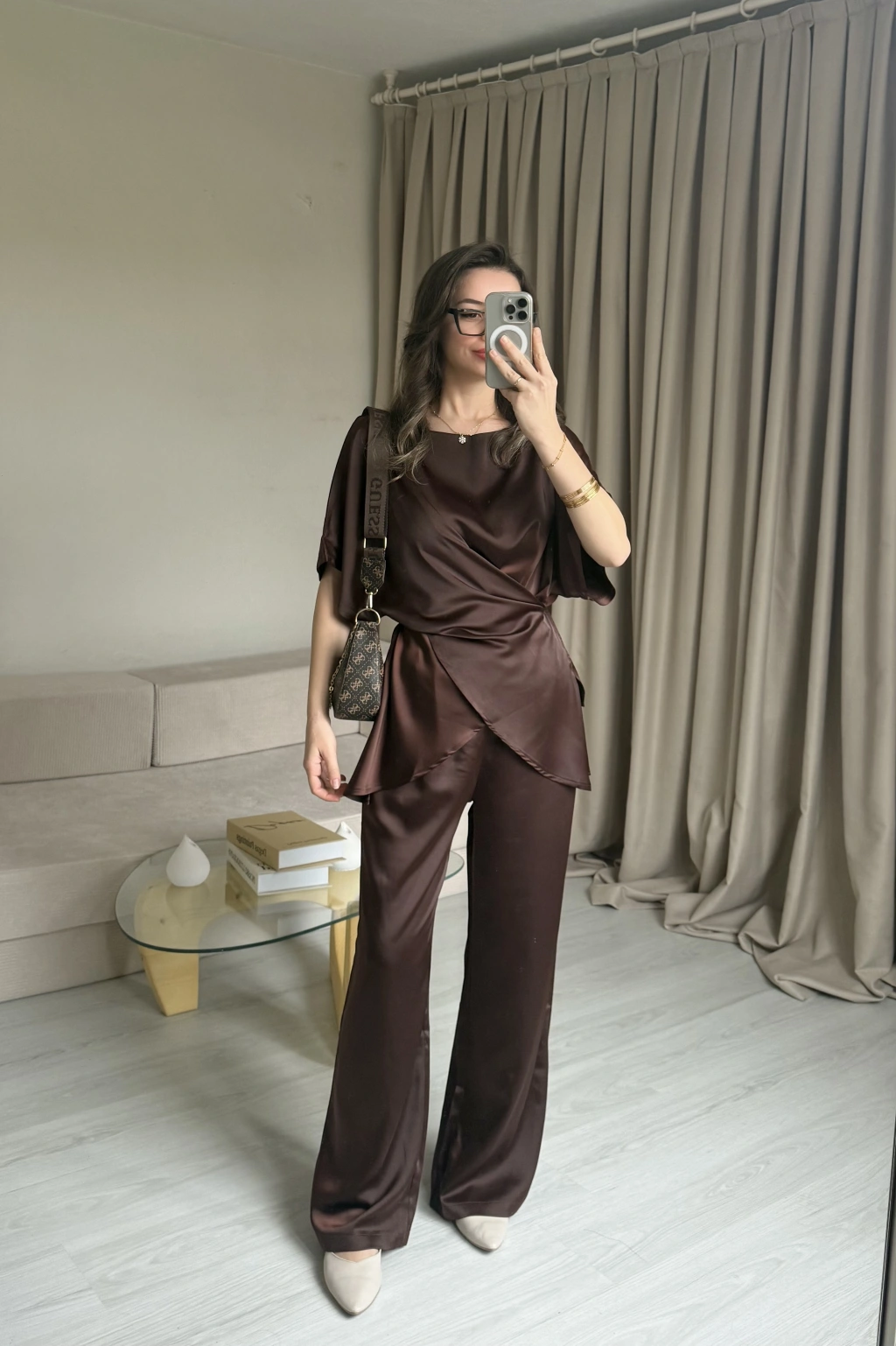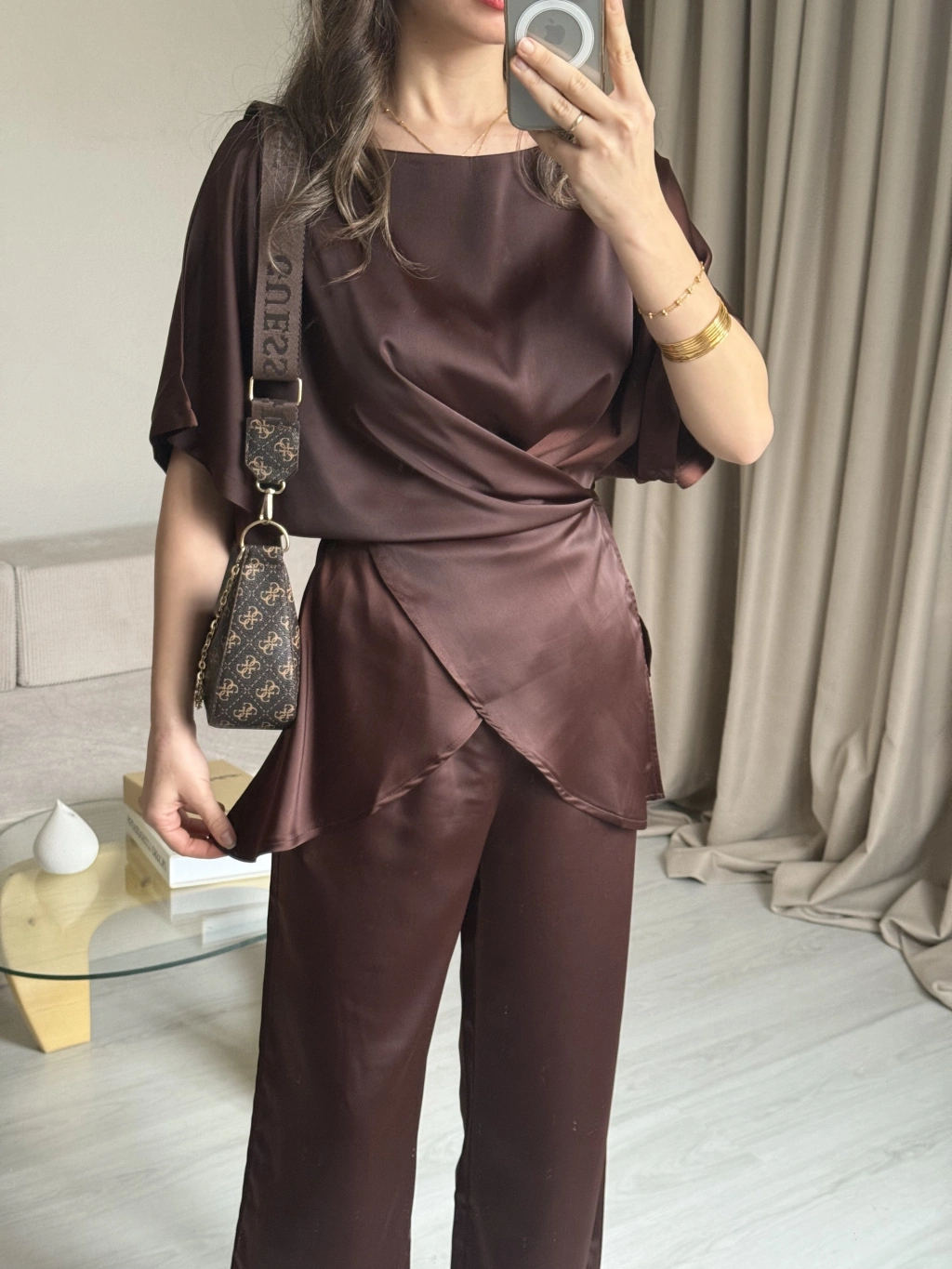 Kahve Bağlamalı Saten Takım