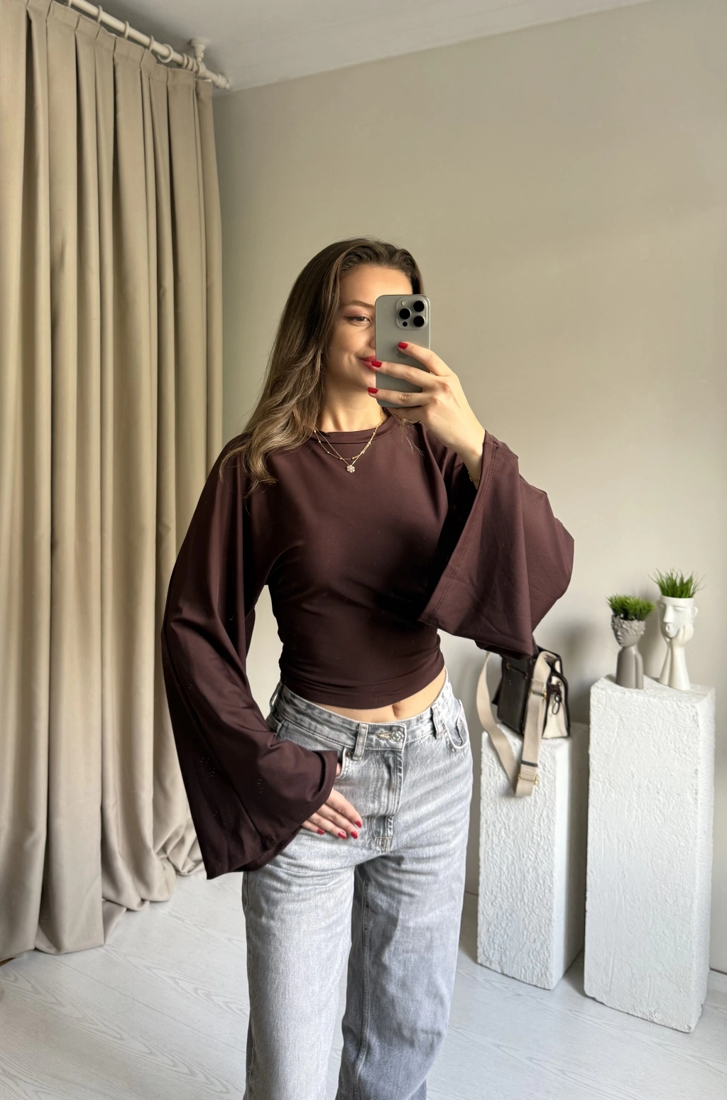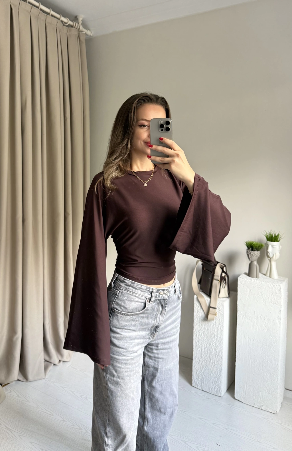 Kahve Belden Oturtmalı Yarasa Kol Bluz