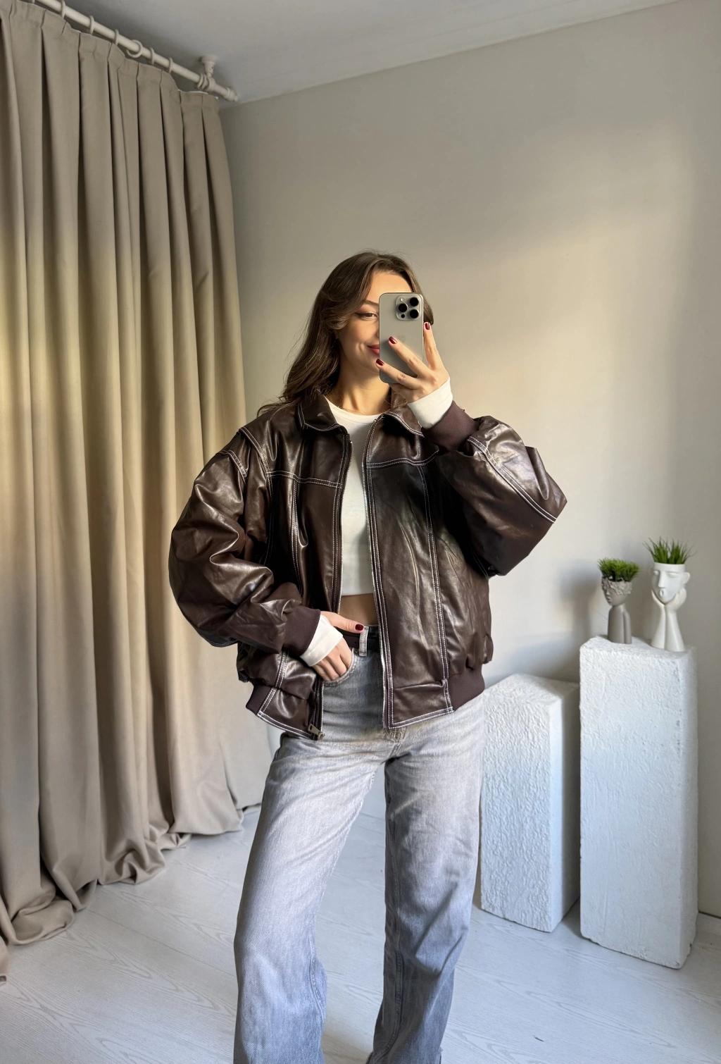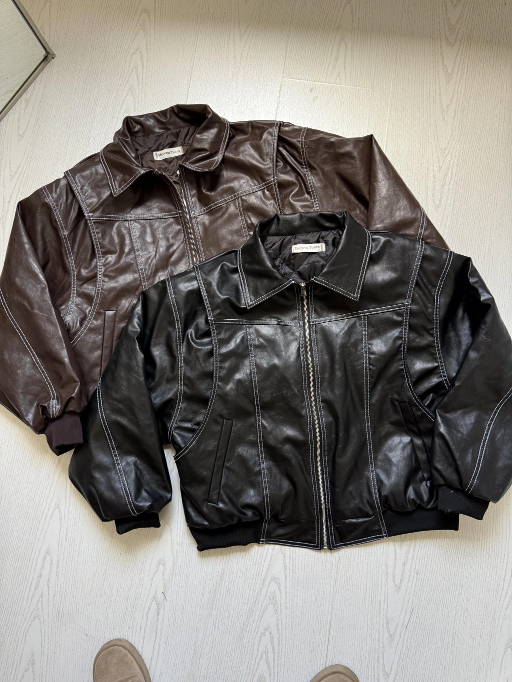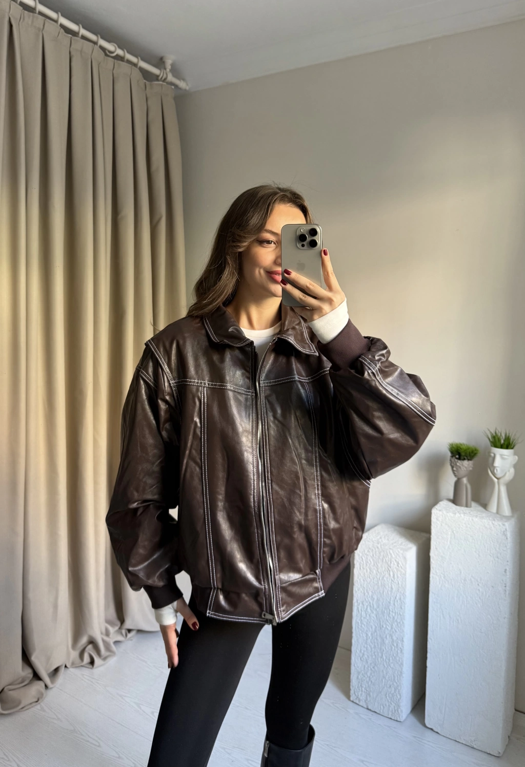 Kahve Dikiş Detaylı Premium Deri Ceket