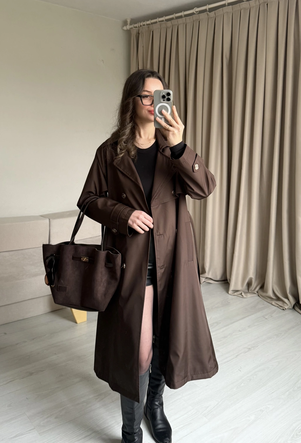 Kahve Düğme Detaylı Uzun Trençkot