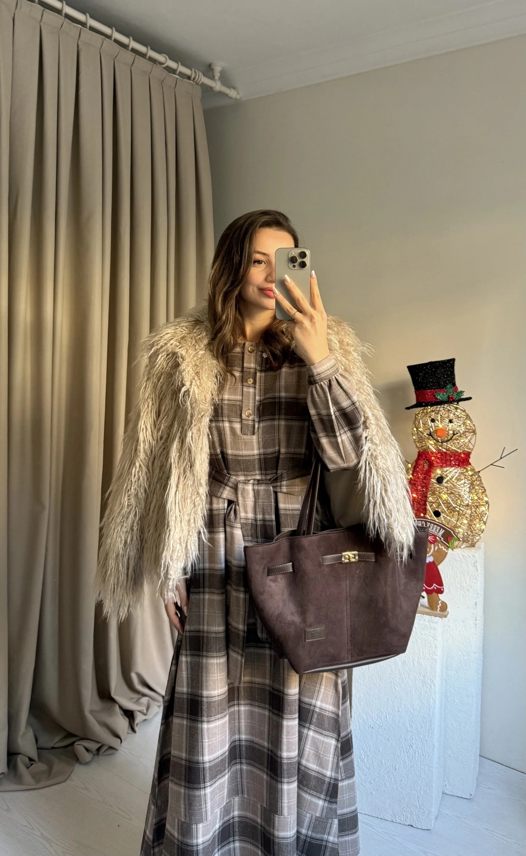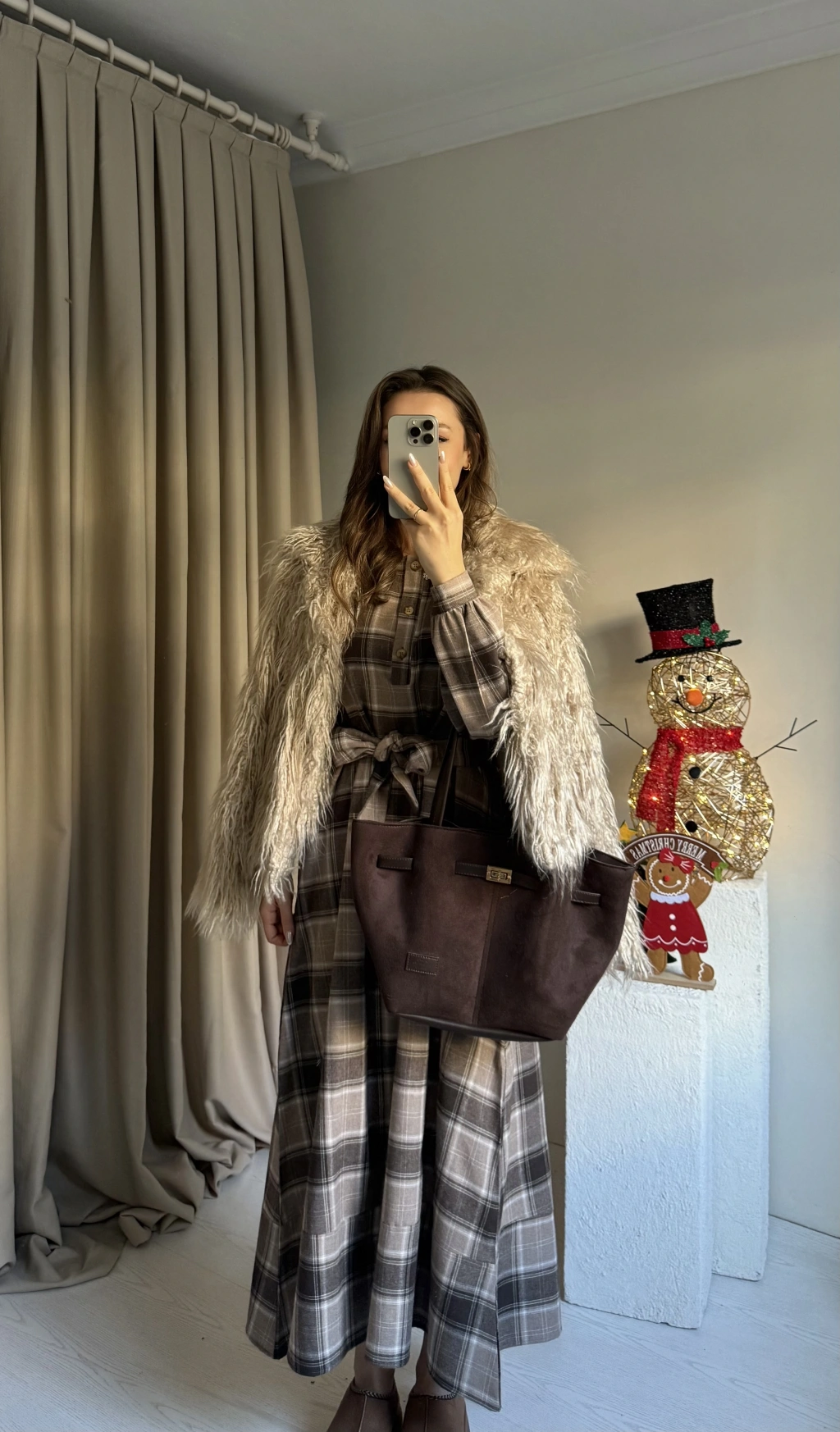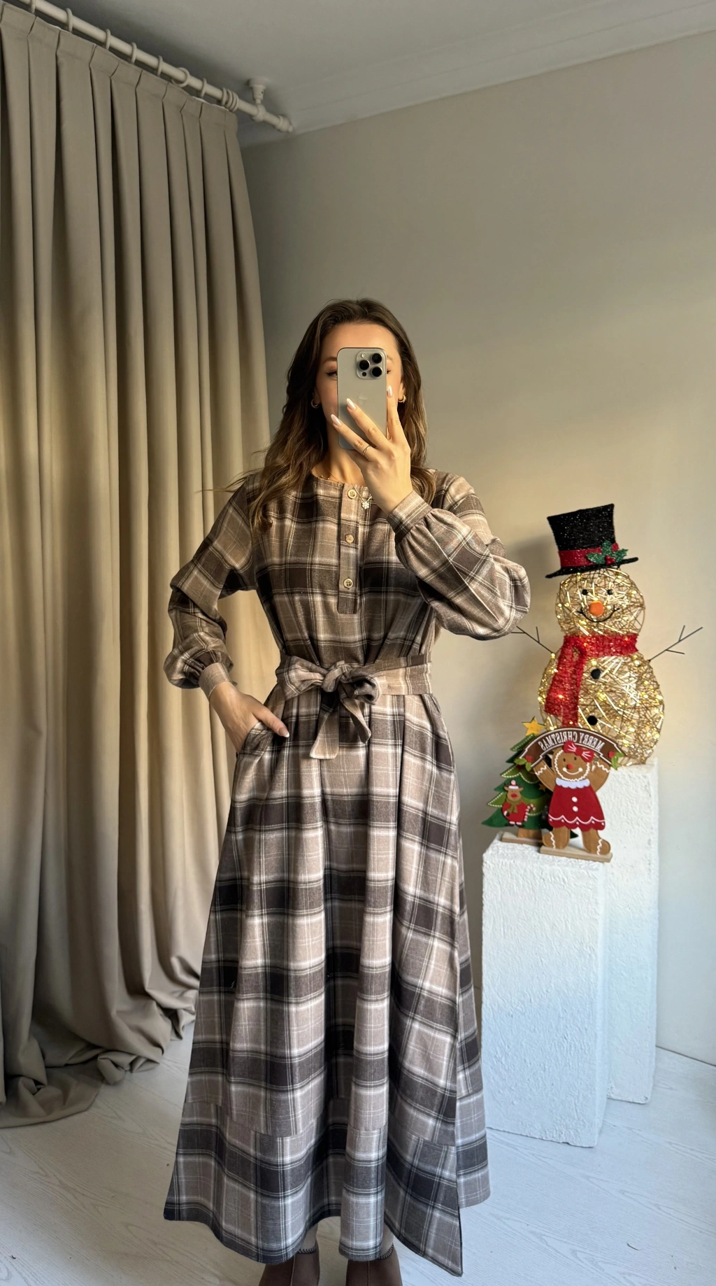 Kahve Ekose Kuşaklı Maxi Boy Elbise