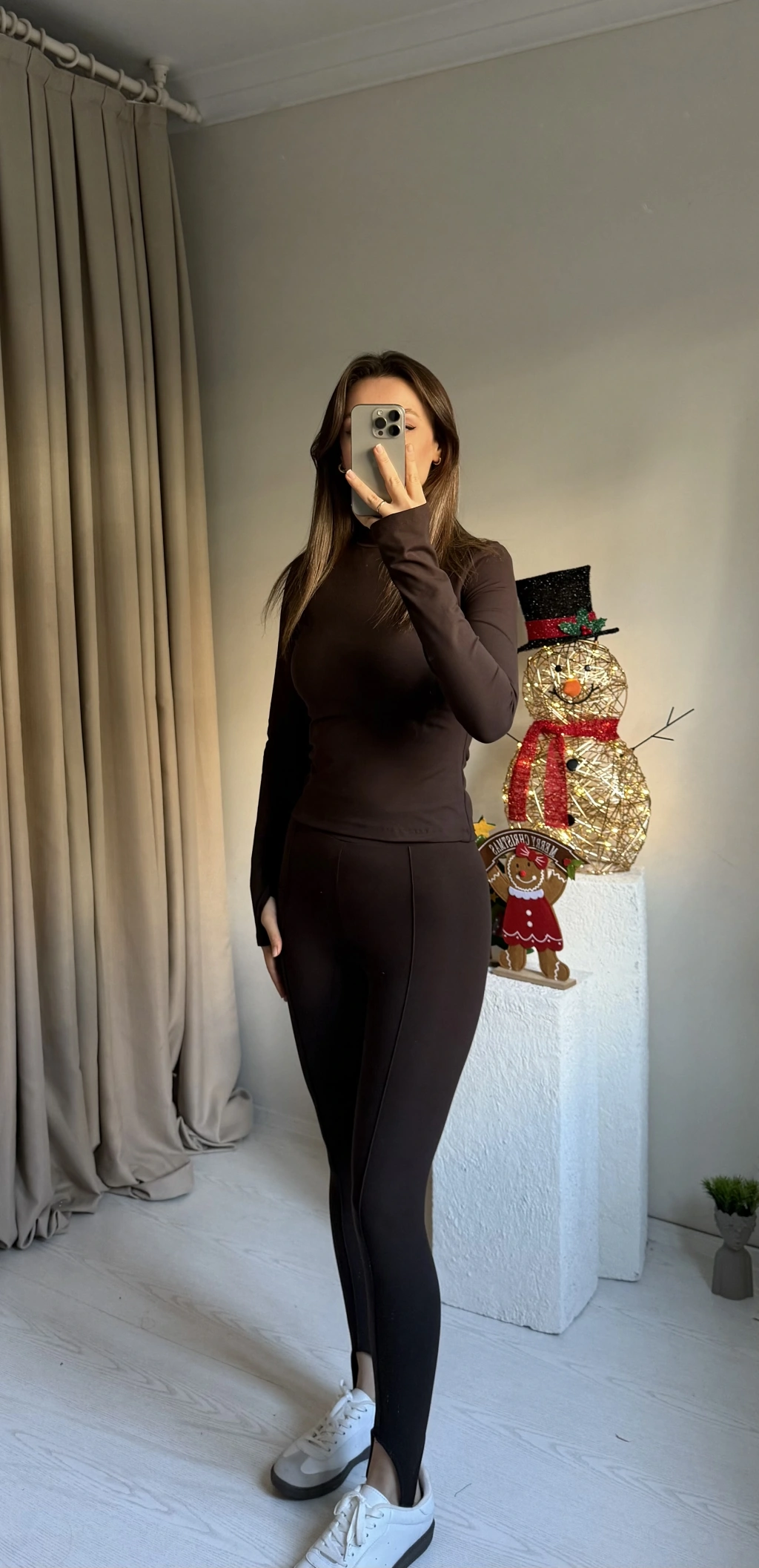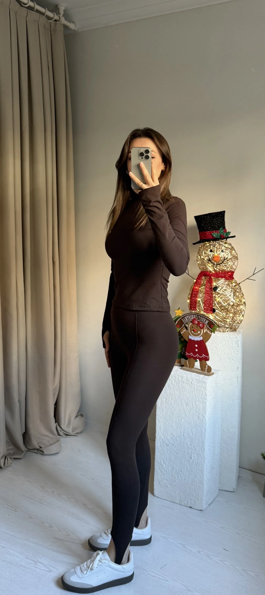 Kahve Lastik Geçirmeli Vatkalı Tayt Takım
