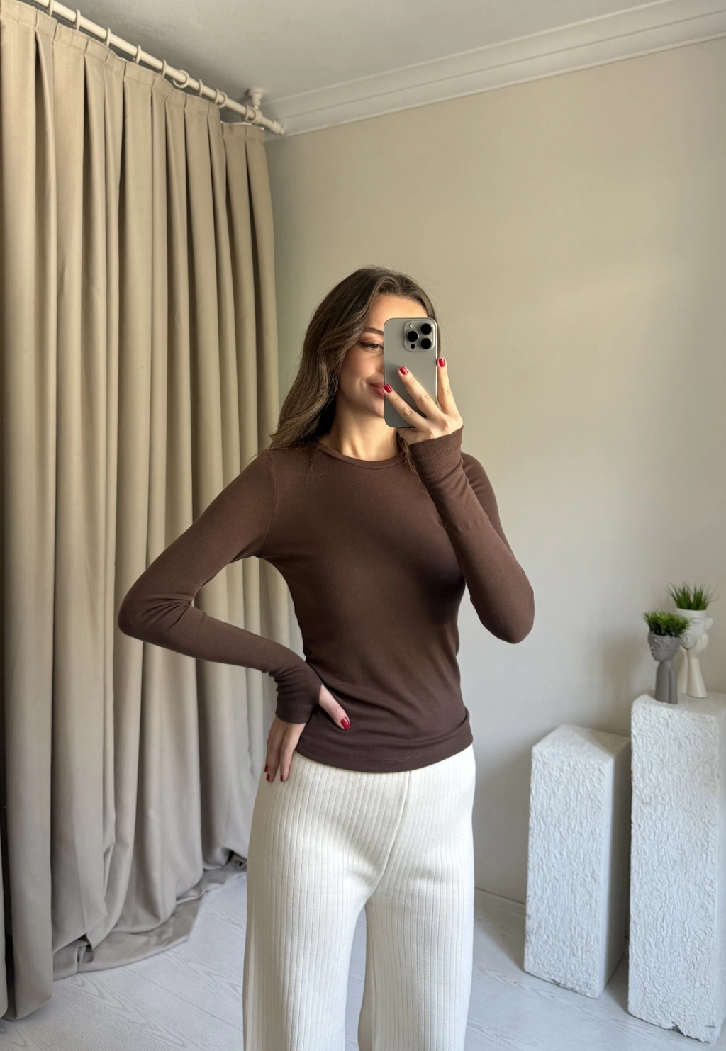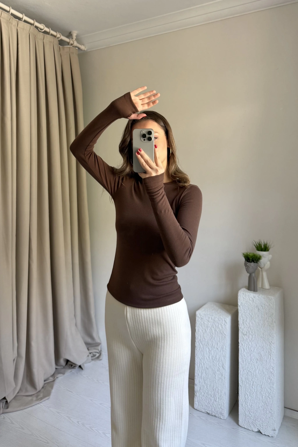 Kahve Modal Kumaş Parmak Geçirmeli Bluz