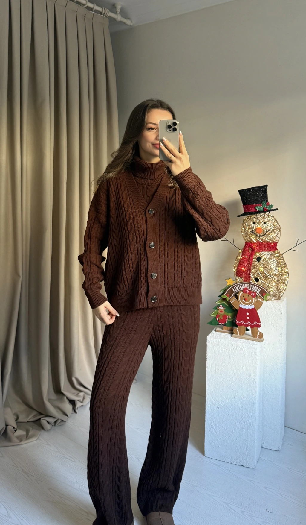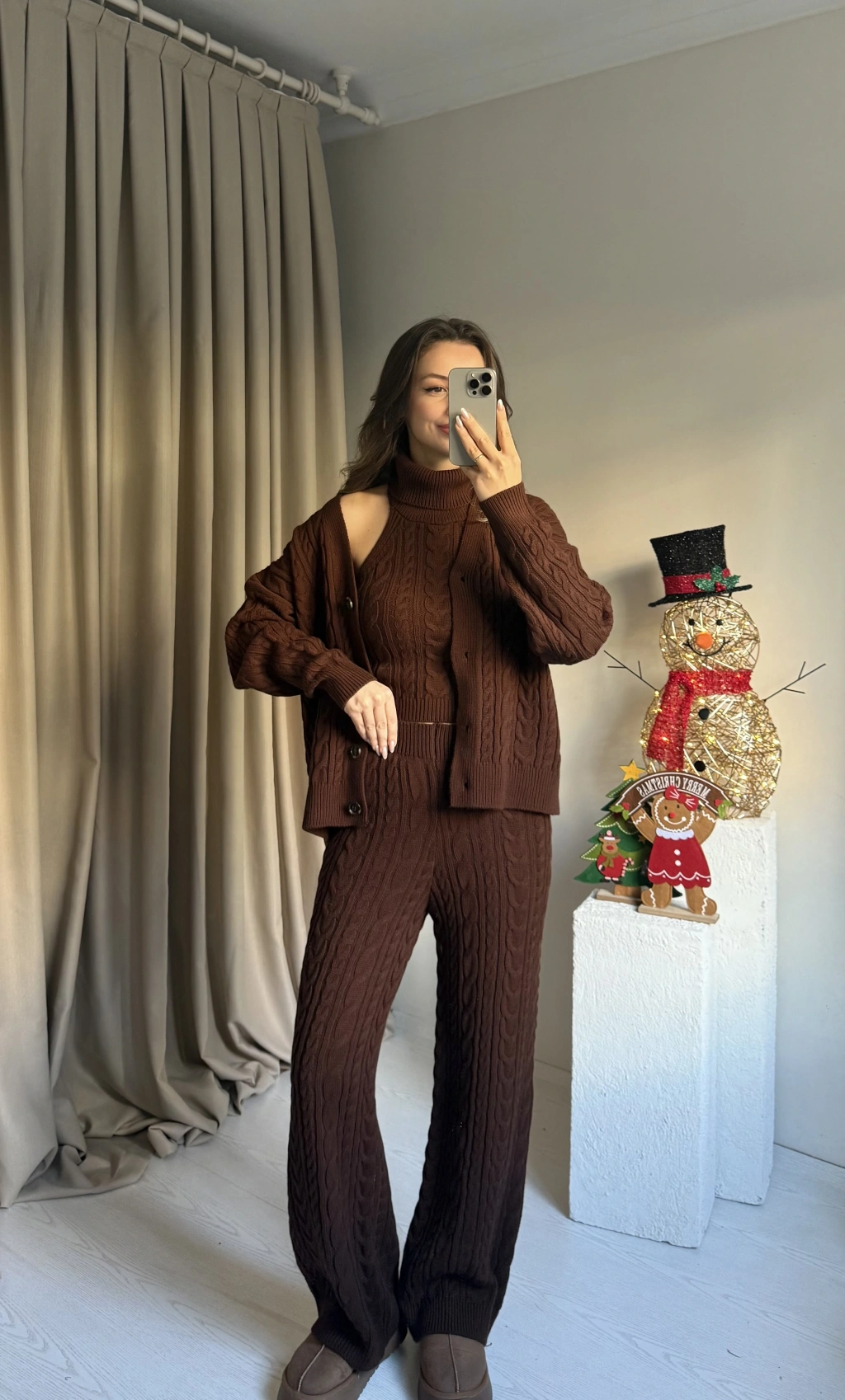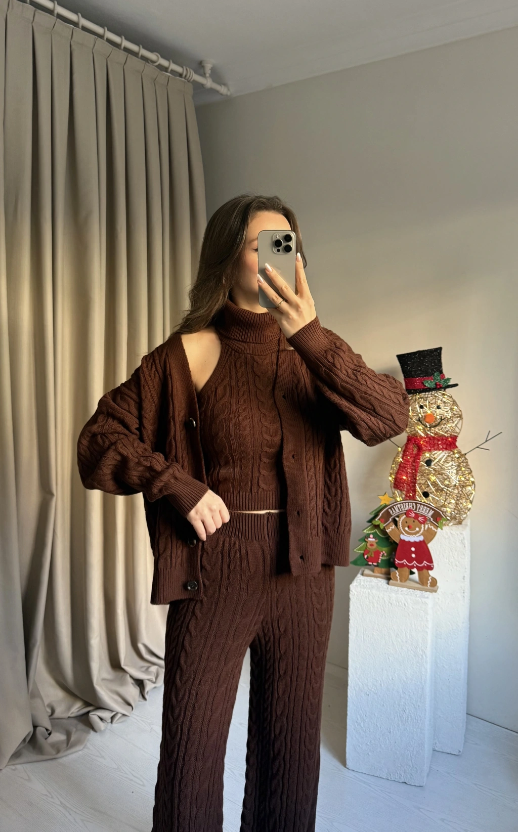 Kahve Üçlü Örgü Triko Takım