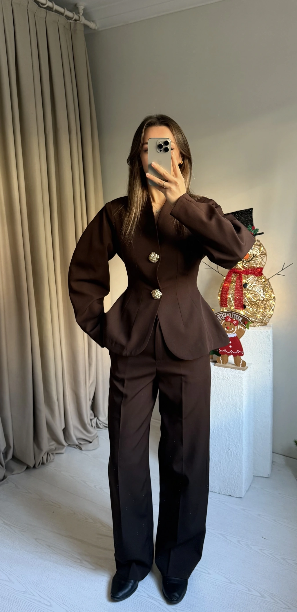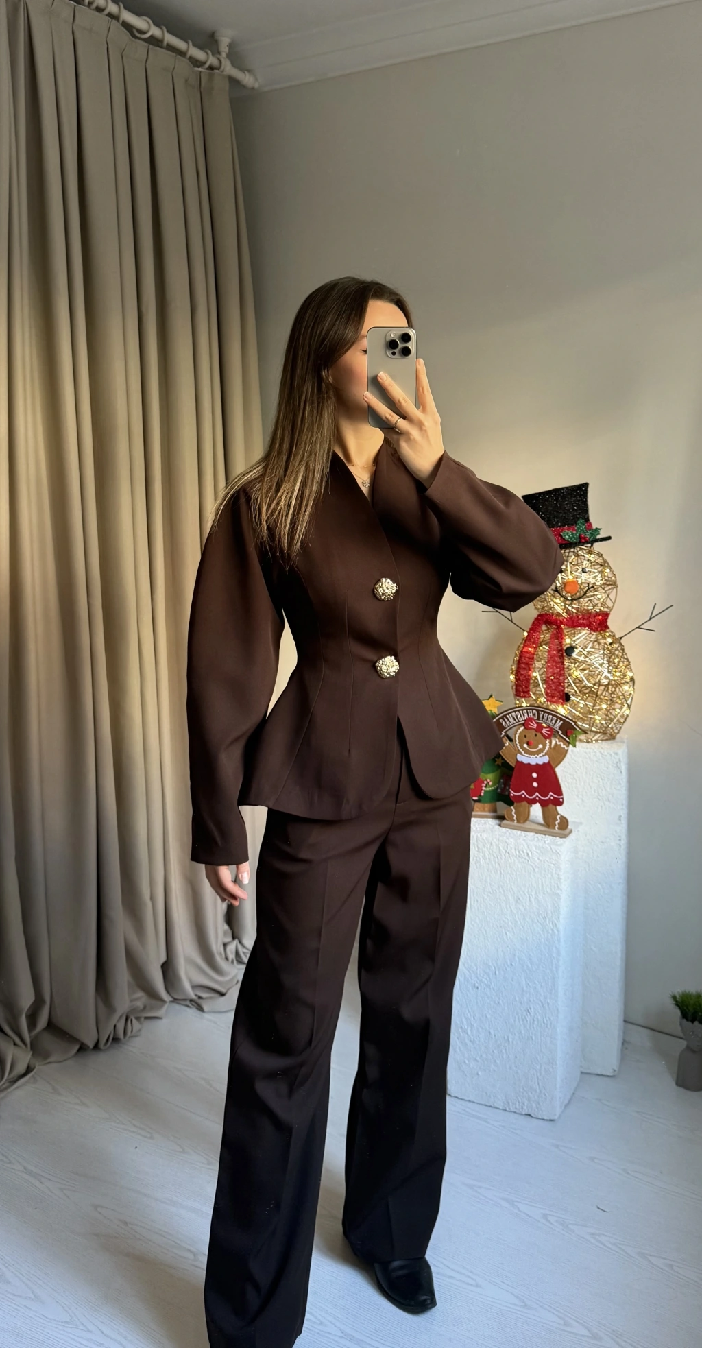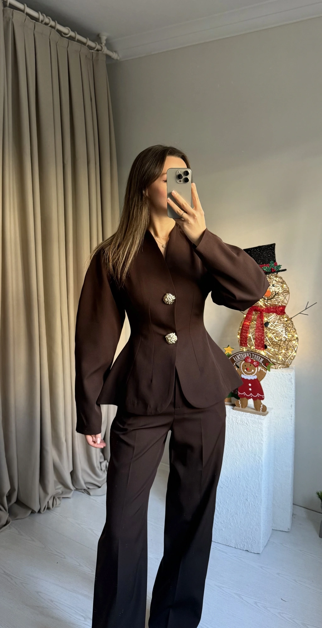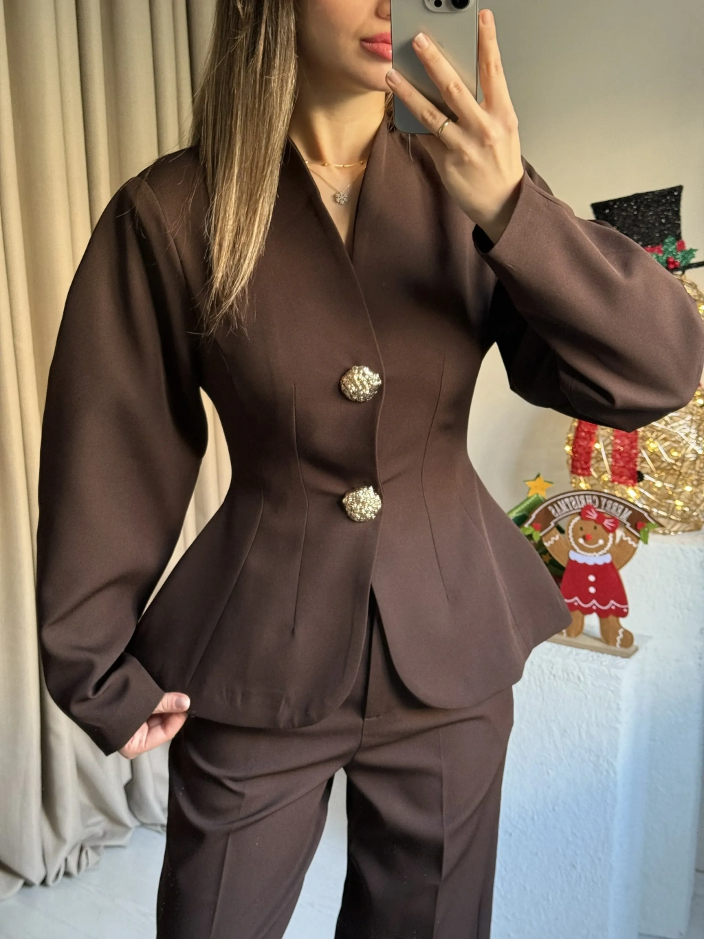 Kahve Vatkalı Düğme Detay Takım