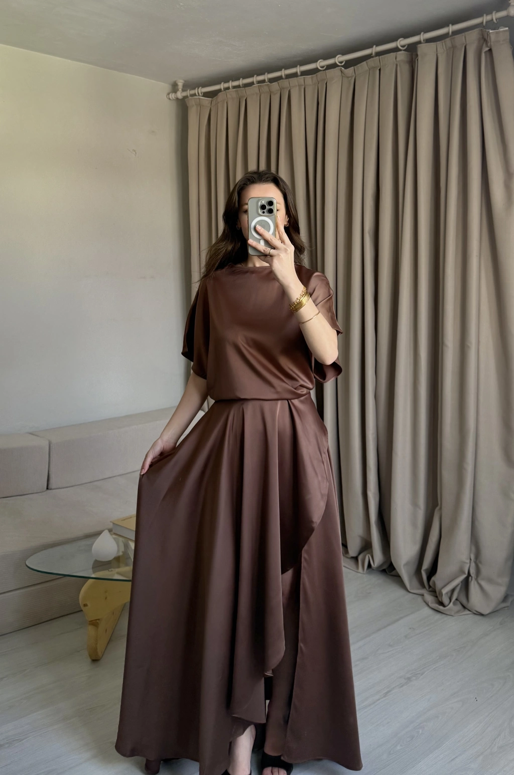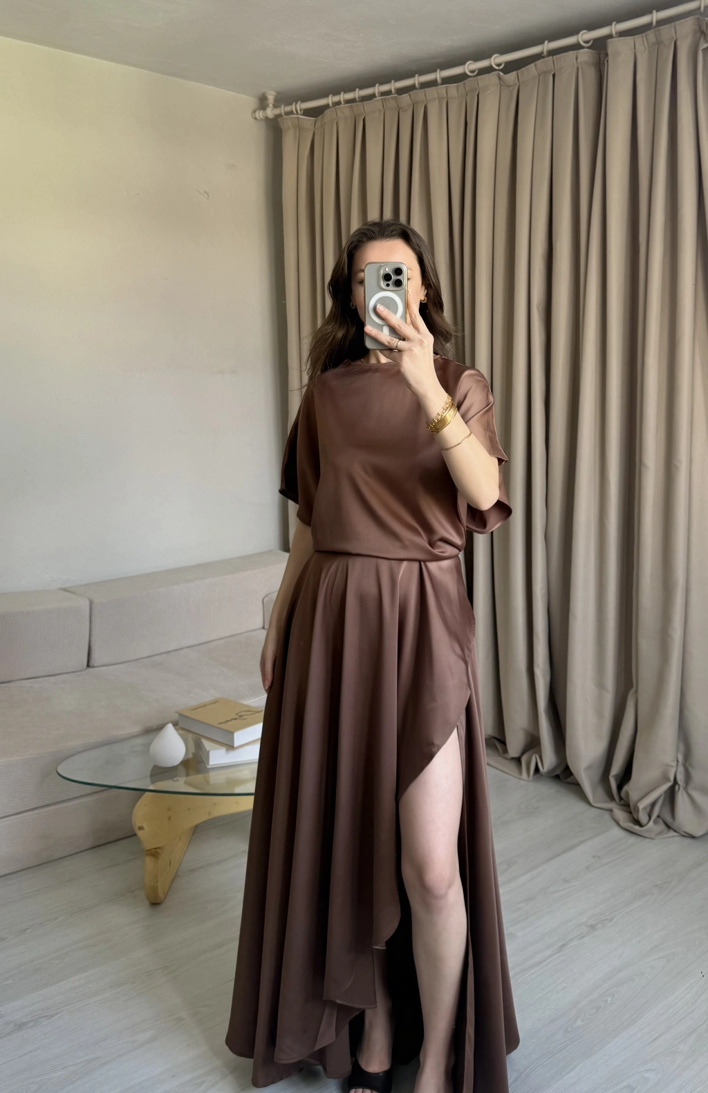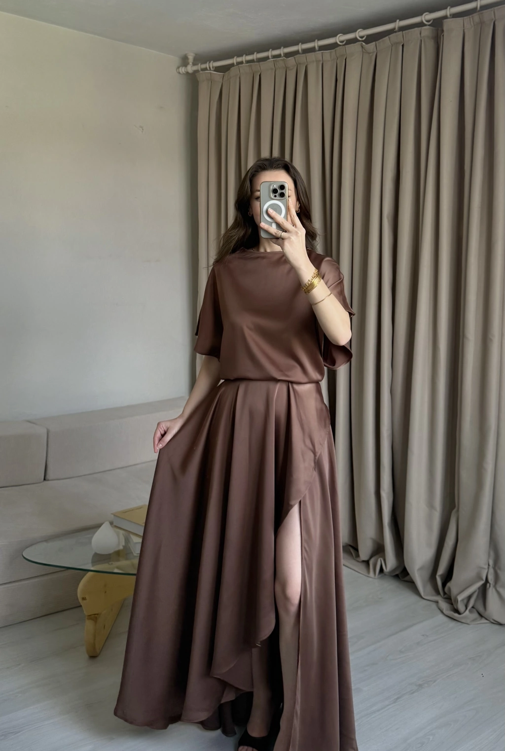 Kahve Yırtmaçlı Saten Elbise