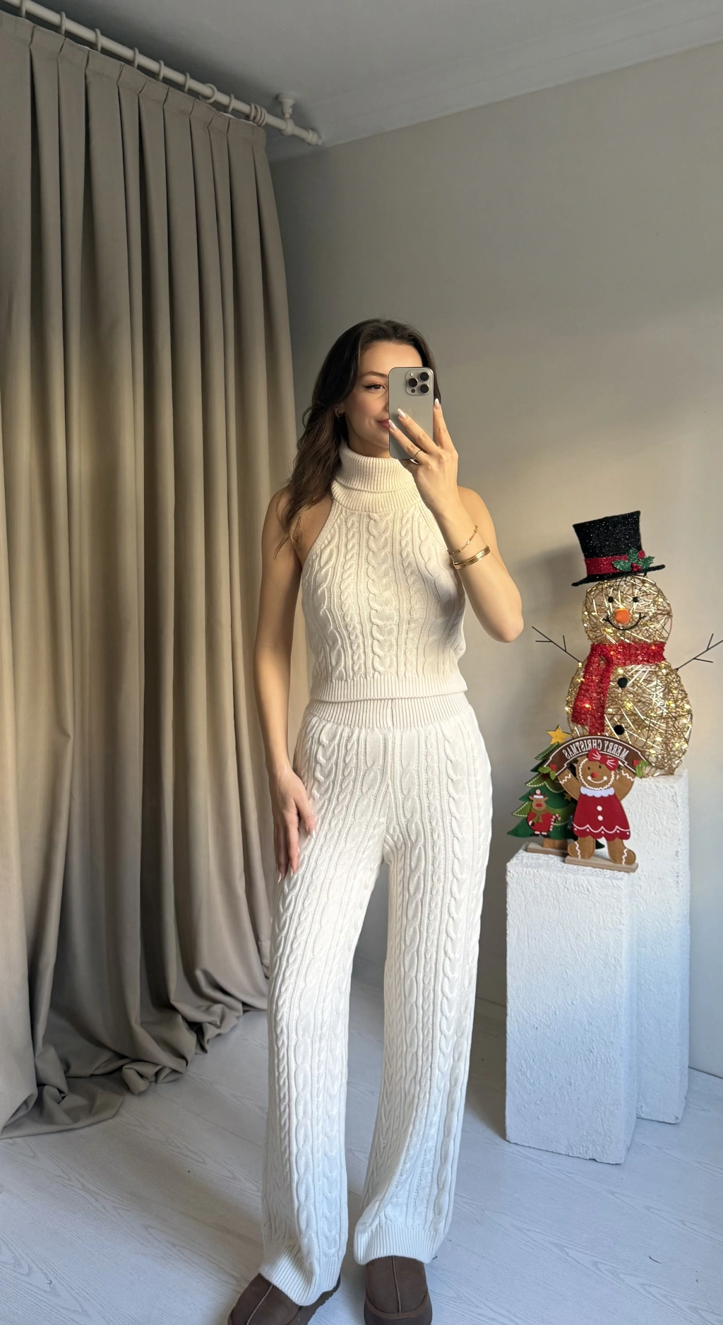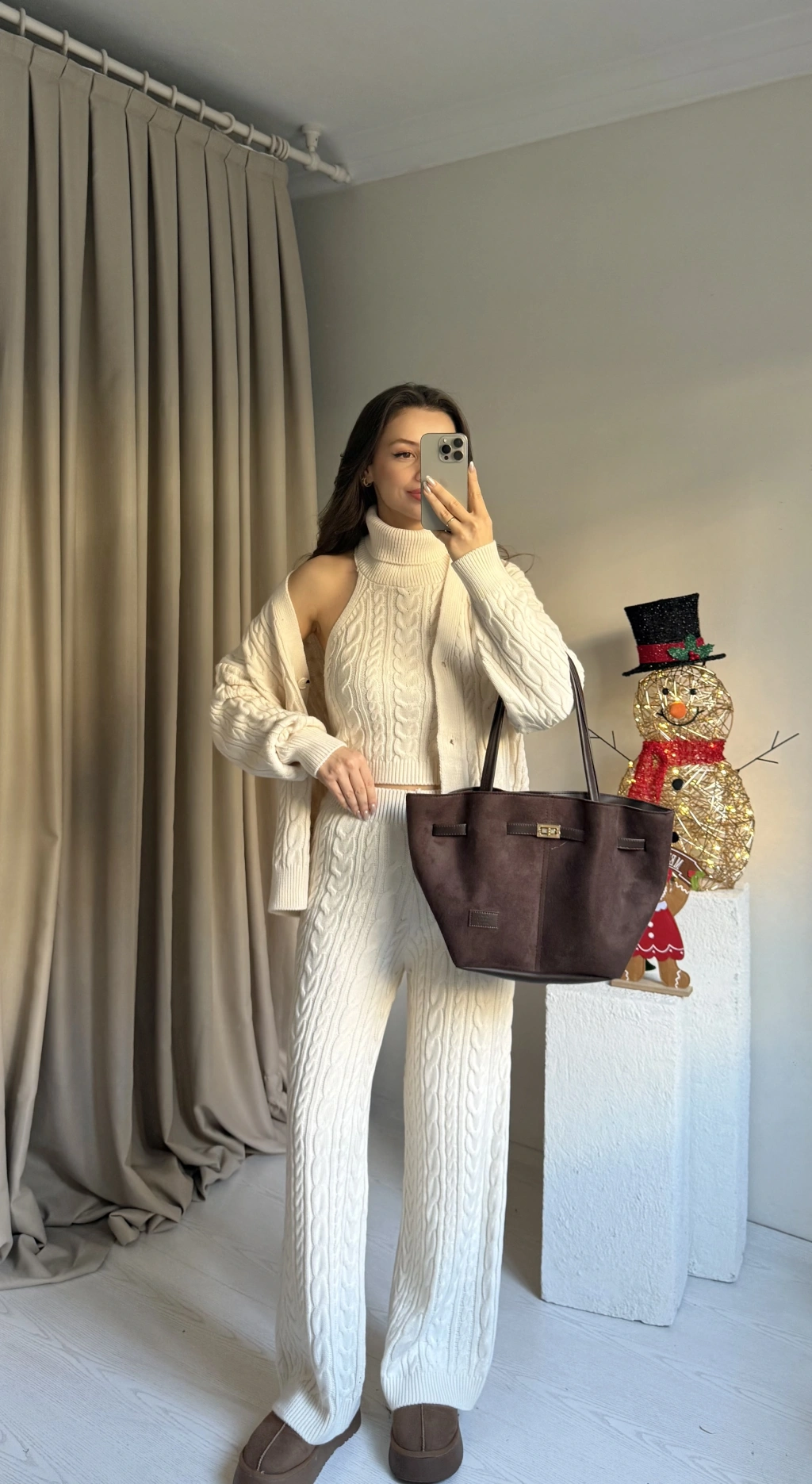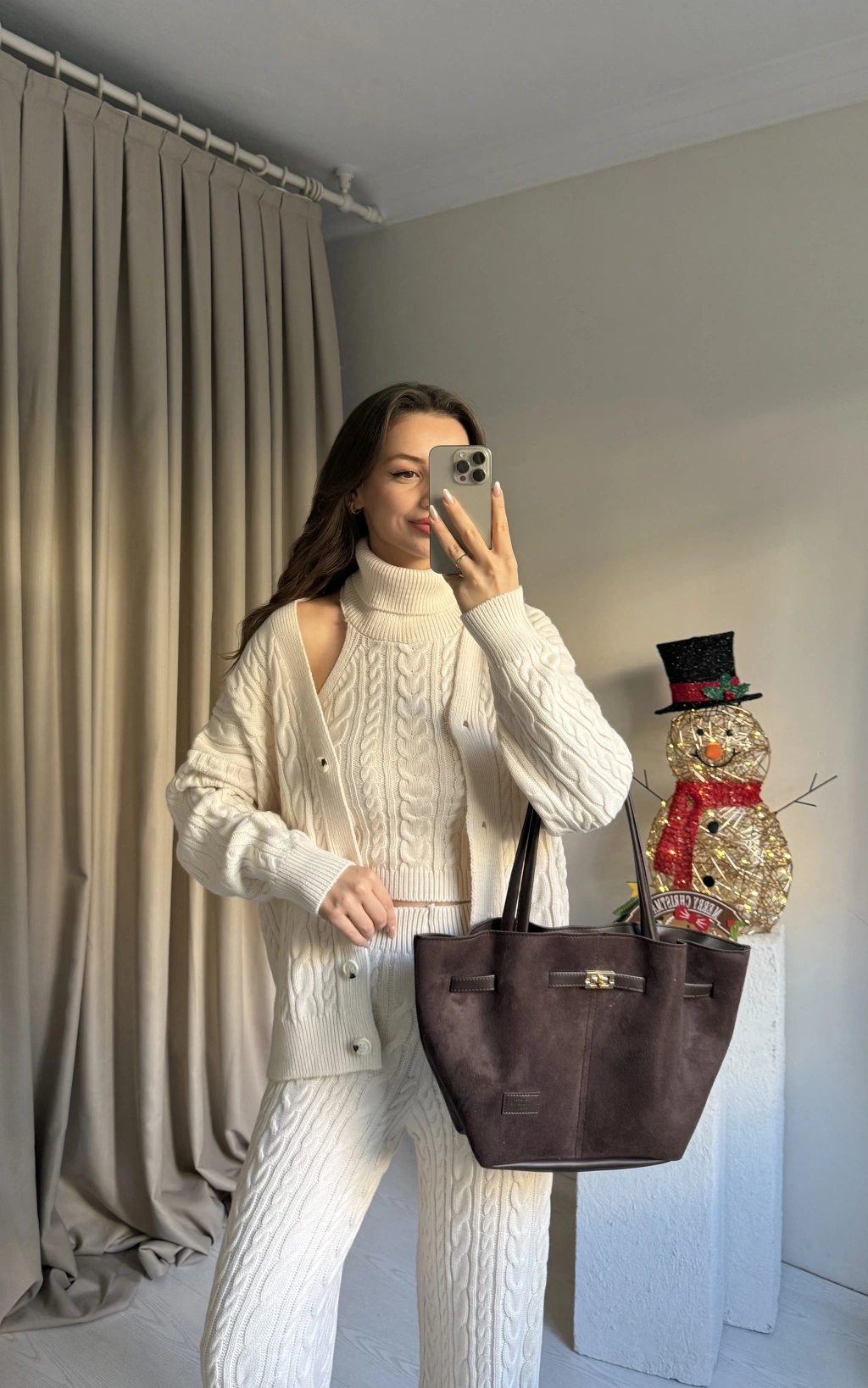 Krem Üçlü Örgü Triko Takım