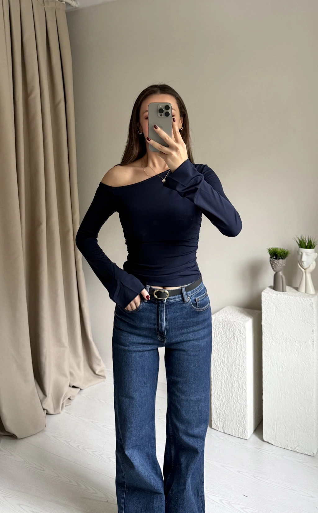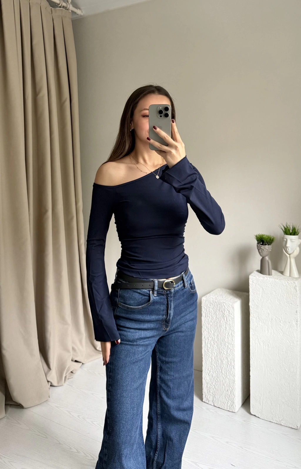 Lacivert Düşük Omuz İspanyol Kol Bluz