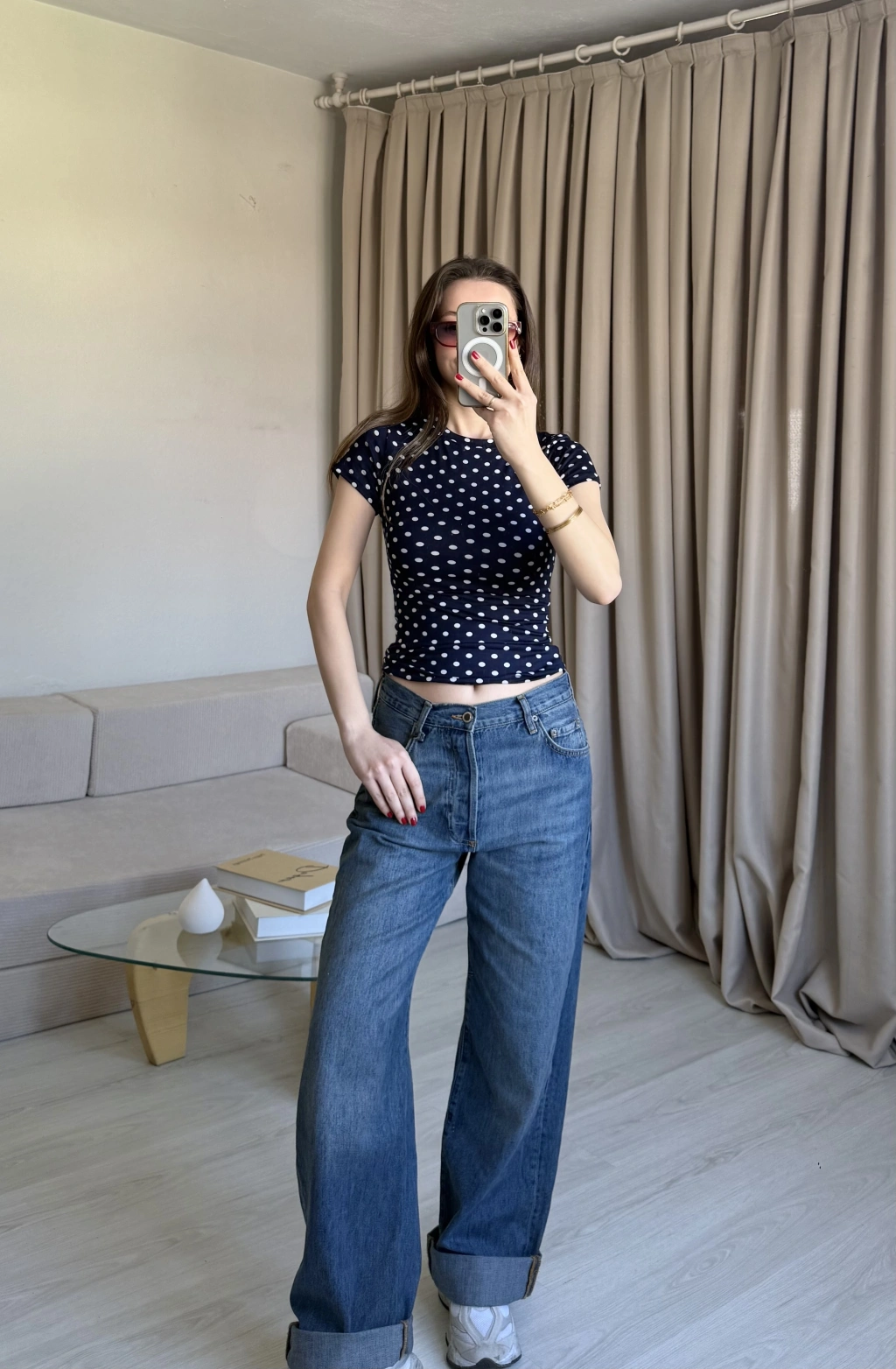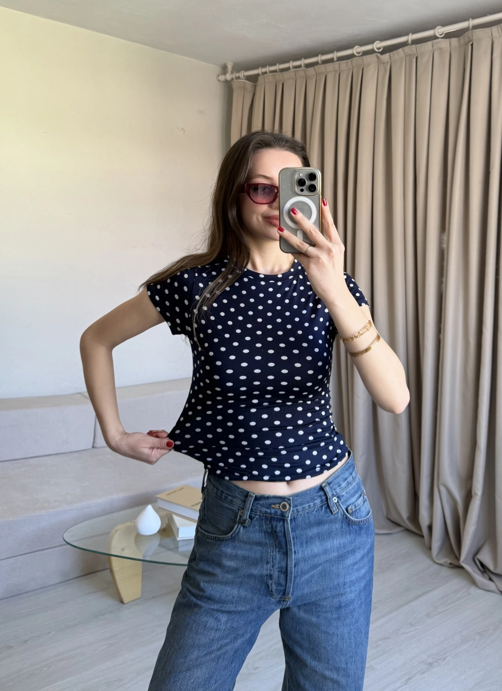 Lacivert Puantiyeli Basic Kısa Kol Bluz