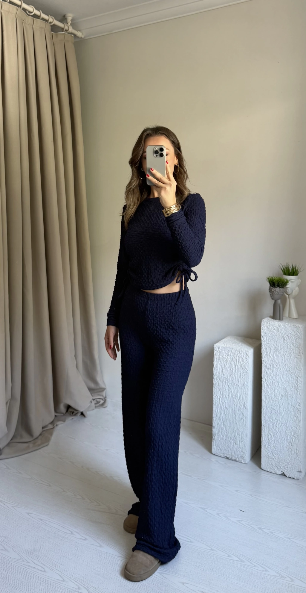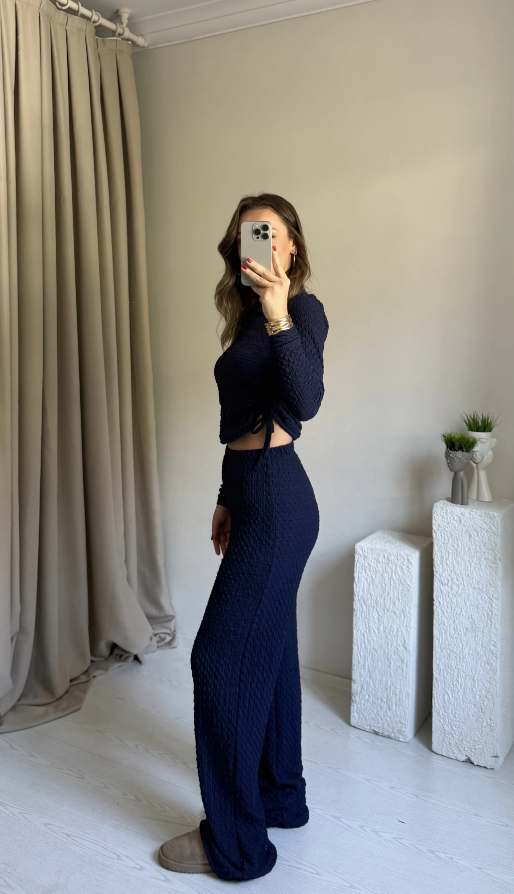 Lacivert Yanları Büzgü Uzun Kollu Takım