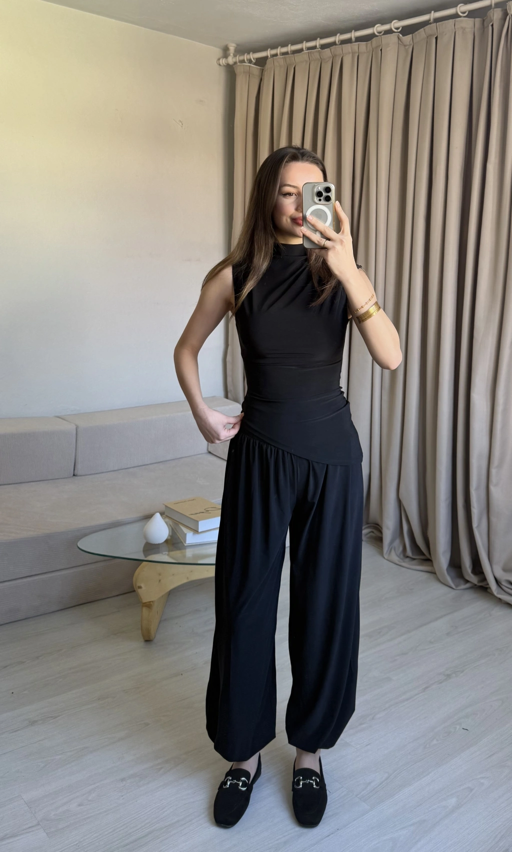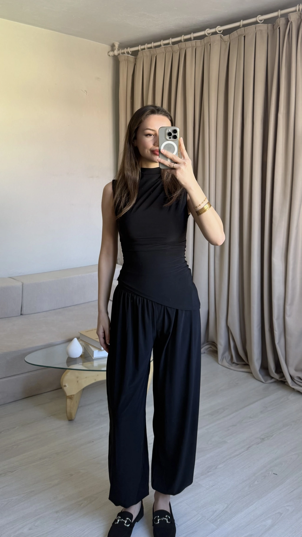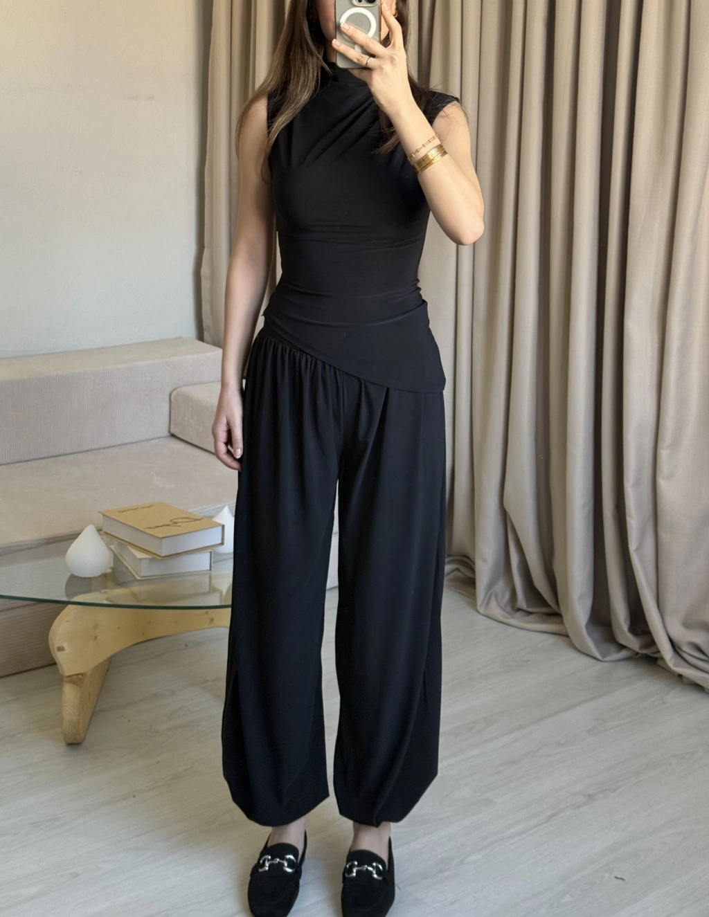 Siyah Asimetrik Kesim Şalvar Pantolon Takım