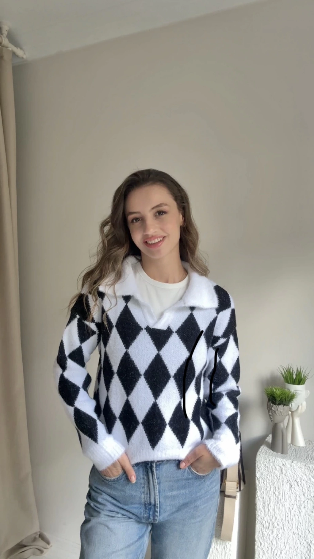Siyah Baklava Desenli Polo Yaka Kazak