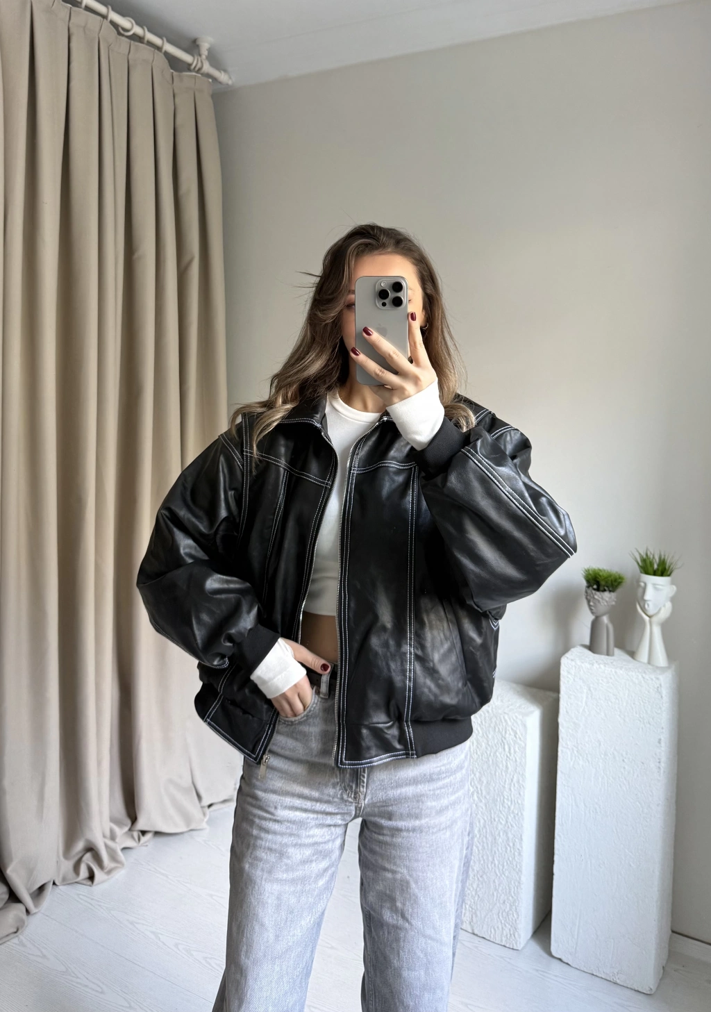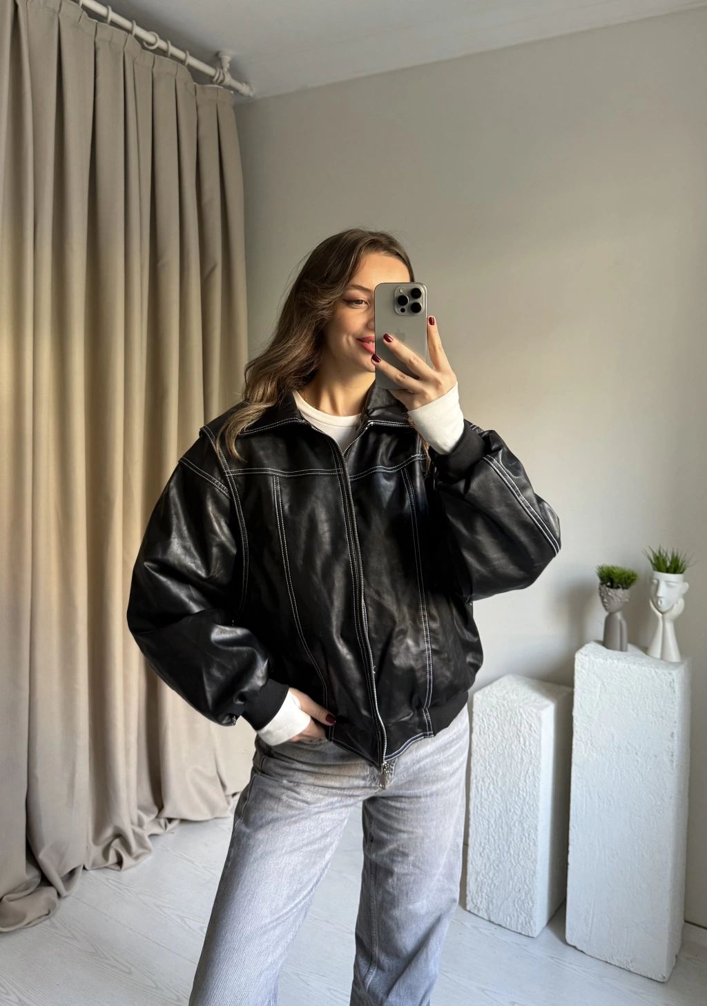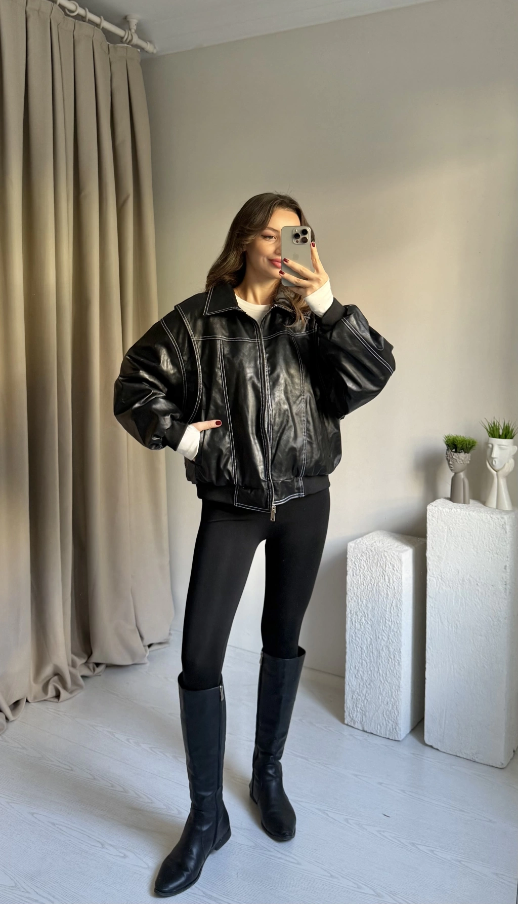 Siyah Dikiş Detaylı Premium Deri Ceket