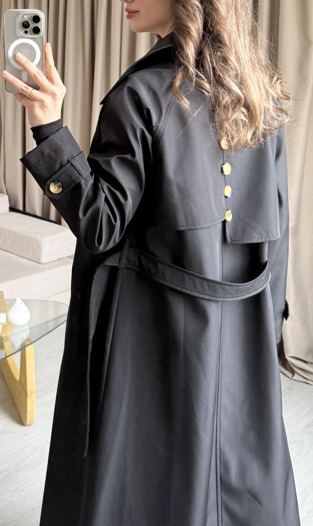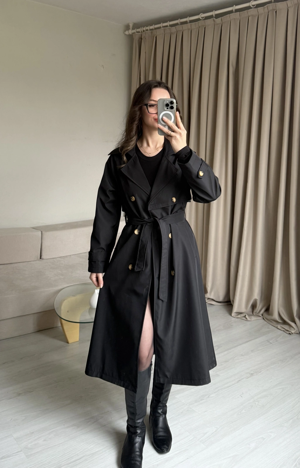 Siyah Düğme Detaylı Uzun Trençkot