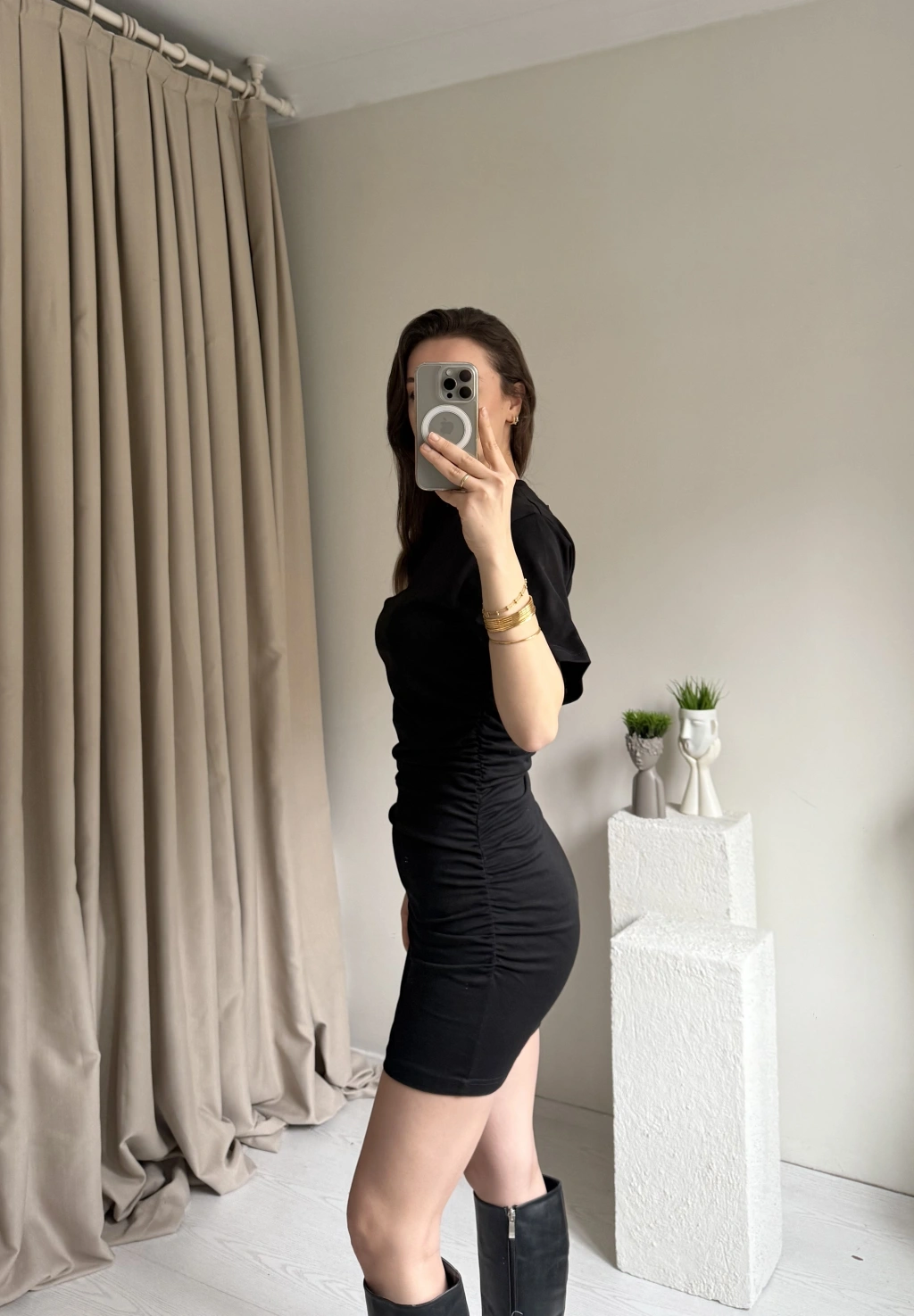 Siyah Yan Büzgülü Tshirt Elbise